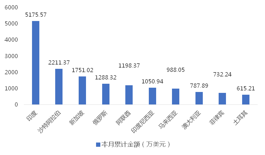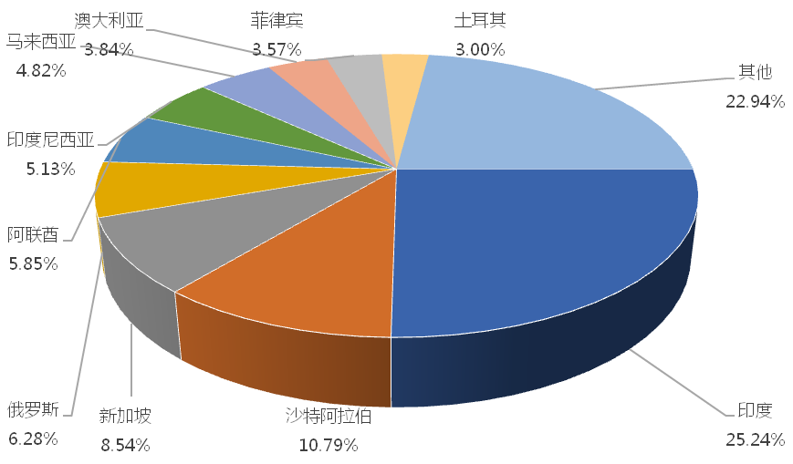 1-3月,我國履帶式起重機出口金額排名前十的國家/地區分別為印度、沙特阿拉伯、新加坡、俄羅斯、阿聯酋、印度尼西亞、馬來西亞、澳大利亞、菲律賓、土耳其,合計占我國該產品出口總額的77.06%。其中,向印度出口最多,金額為5175.57萬美元,占出口總額的25.24%。