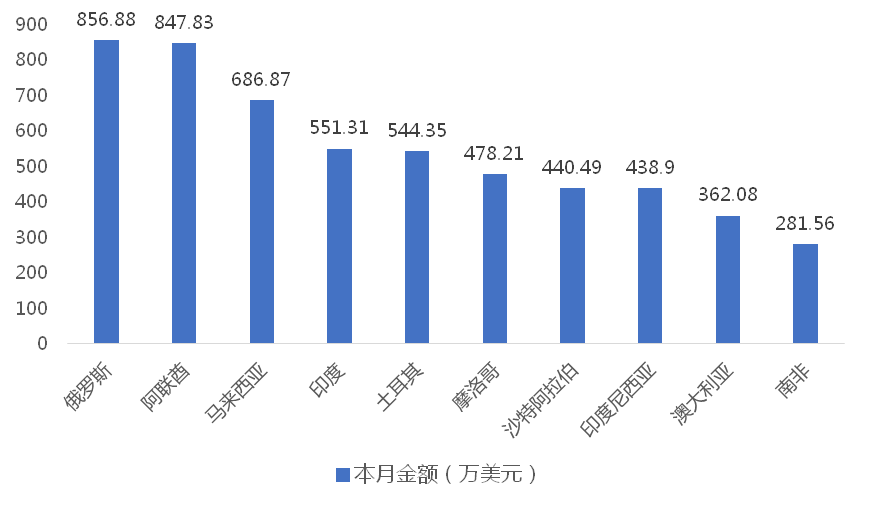 2025年3月,我國履帶式起重機出口金額排名前十位的國家/地區分別為俄羅斯、阿聯酋、馬來西亞、印度、土耳其、摩洛哥、沙特阿拉伯、印度尼西亞、澳大利亞、南非,合計占我國該產品出口總額的74.46%。其中,向俄羅斯出口最多,金額為856.88萬美元,占出口總額的11.63%。