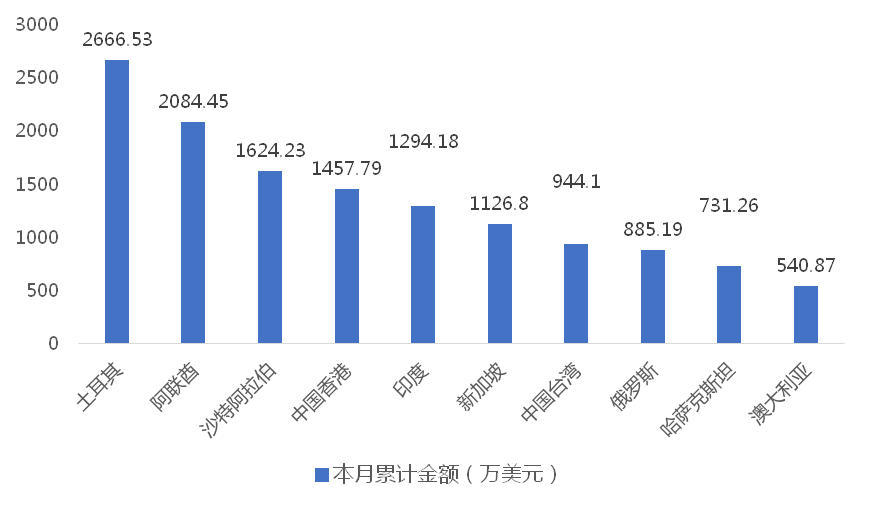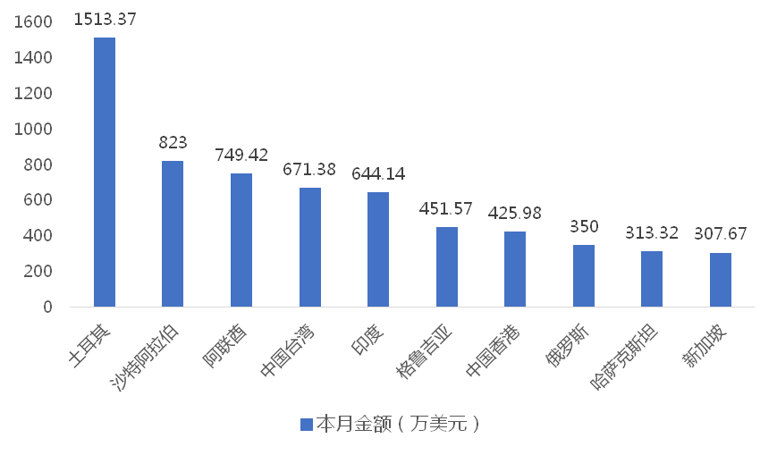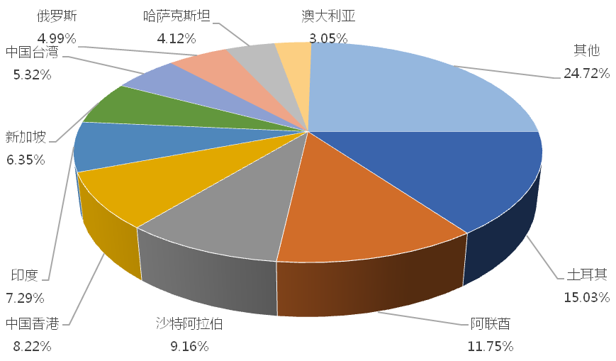 1-3月,我國塔式起重機出口金額排名前十的國家/地區分別為土耳其、阿聯酋、沙特阿拉伯、中國香港、印度、新加坡、中國台灣、俄羅斯、哈薩克斯坦、澳大利亞,合計占我國該產品出口總額的75.28%。其中,向土耳其出口最多,金額為2666.53萬美元,占出口總額的15.03%。