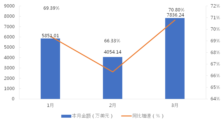 1-3月,我國塔式起重機累計出口金額為17741.39萬美元,同比增長69.29%;累計出口數量為1546台,同比增長51.57%;出口均價為11.48萬美元/台,同比增長11.78%。