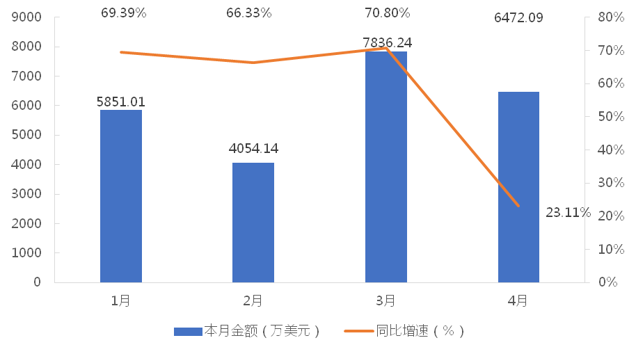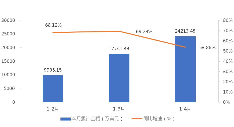 1-4月,我國塔式起重機累計出口金額為24213.48萬美元,同比增長53.86%;累計出口數量為2165台,同比增長46.88%;出口均價為11.18萬美元/台,同比增長4.68%。