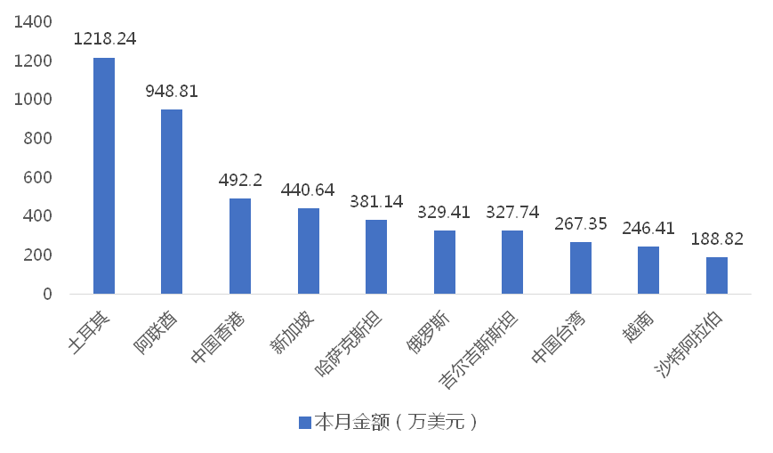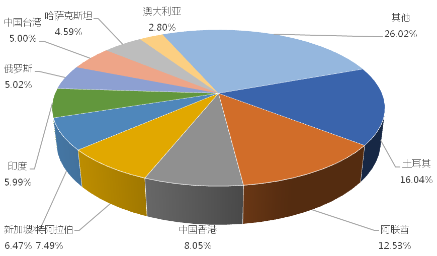 1-4月,我國塔式起重機出口金額排名前十的國家/地區分別為土耳其、阿聯酋、中國香港、沙特阿拉伯、新加坡、印度、俄羅斯、中國台灣、哈薩克斯坦、澳大利亞,合計占我國該產品出口總額的73.98%。其中,向土耳其出口最多,金額為3884.77萬美元,占出口總額的16.04%。