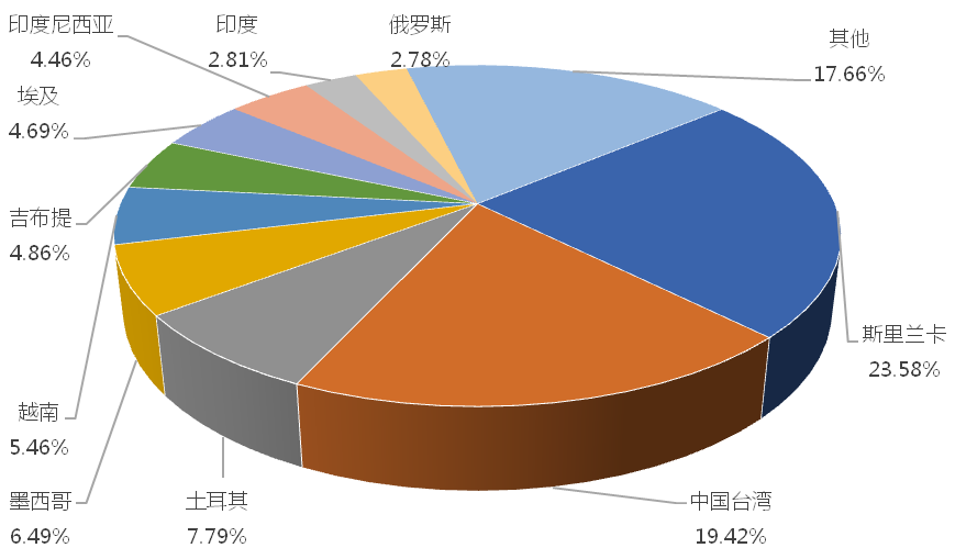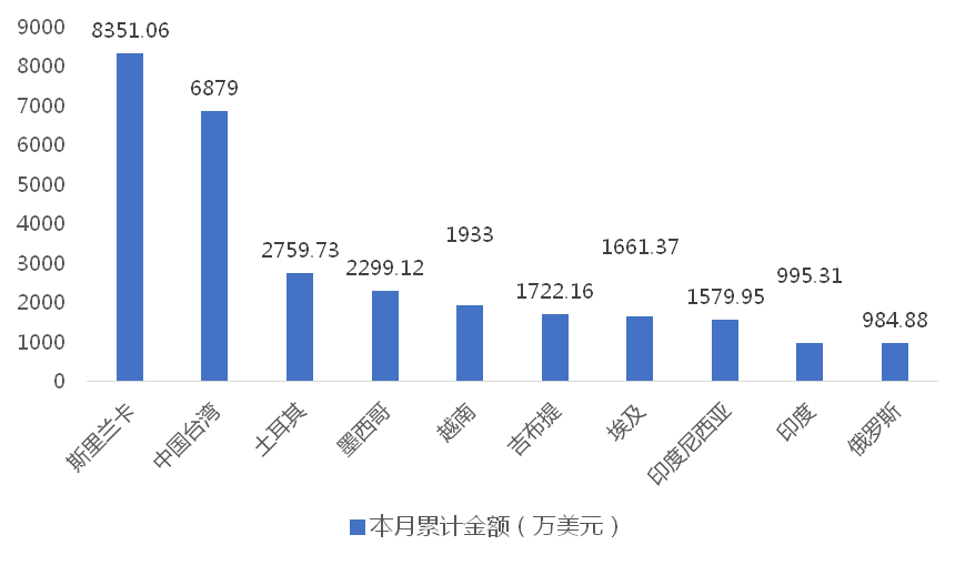 1-6月,我國龍門式起重機出口金額排名前十的國家/地區分別為斯裏蘭卡、中國台灣、土耳其、墨西哥、越南、吉布提、埃及、印度尼西亞、印度、俄羅斯,合計占我國該產品出口總額的82.34%。其中,向斯裏蘭卡出口最多,金額為8351.06萬美元,占出口總額的23.58%。
