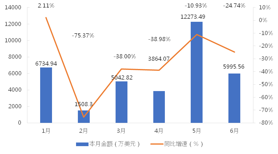 1-6月,我國龍門式起重機累計出口金額為35419.18萬美元,同比下降27.61%;累計出口數量為2216台,同比增長13.47%;出口均價為15.98萬美元/台,同比下降36.21%。