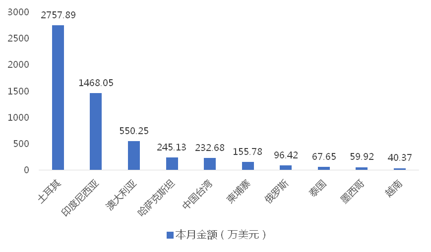 2025年6月,我國龍門式起重機出口金額排名前十位的國家/地區分別為土耳其、印度尼西亞、澳大利亞、哈薩克斯坦、中國台灣、柬埔寨、俄羅斯、泰國、墨西哥、越南,合計占我國該產品出口總額的94.64%。其中,向土耳其出口最多,金額為2757.89萬美元,占出口總額的46.00%。