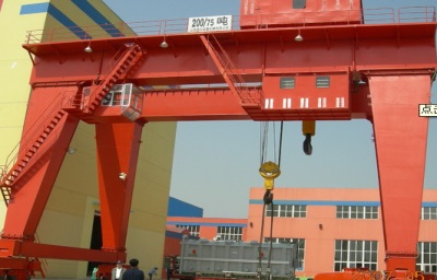 它的金屬結構像門形框架,承載主梁下安裝兩條支腳,可以直接在地麵的軌道上行走,主梁兩端可以具有外伸懸臂梁。