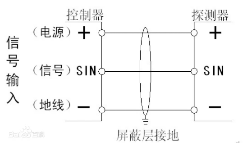 控製器采用三芯屏蔽線與探測器連接(注:單芯線徑不低於0.75mm國標線,依實際距離而定),將屏蔽層與控製器機殼相連並可靠接地。當采用RVV線纜時,應穿金屬管並將金屬管可靠接地。